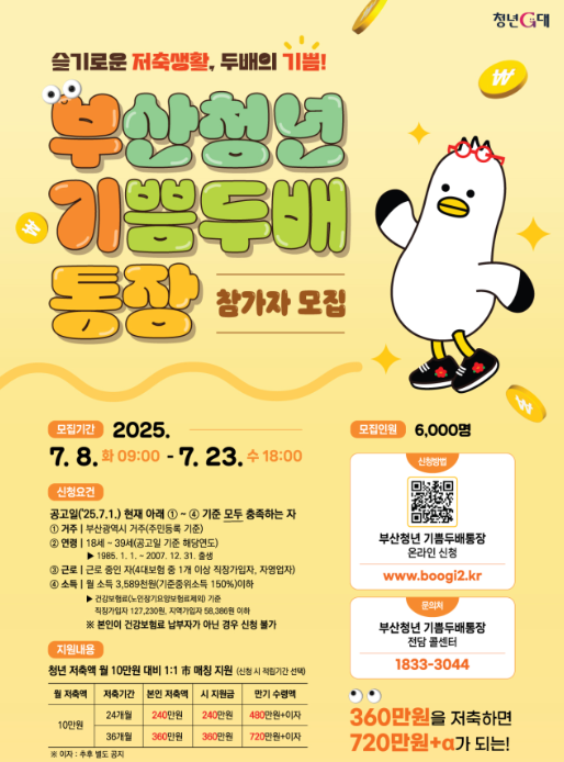 2025년, 부산 청년들을 위한 특별한 재정 지원 프로그램이 다시 시작된다. 바로 ‘부산청년 기쁨두배통장’이다. 이름만 들어도 마음이 따뜻해지는 이 통장 사업은 단순한 저축을 넘어, 청년들의 자립과 미래 설계를 실질적으로 돕기 위한 부산시의 대표적인 자산형성 지원 제도다. 매달 청년이 일정 금액을 저축하면, 동일한 금액을 시에서 매칭해주는 방식으로 최대 720만원 이상의 지원금을 받을 수 있는 이 제도는 청년들에게 단순한 저금통이 아니라, 희망을 키우는 자양분 같은 역할을 한다.