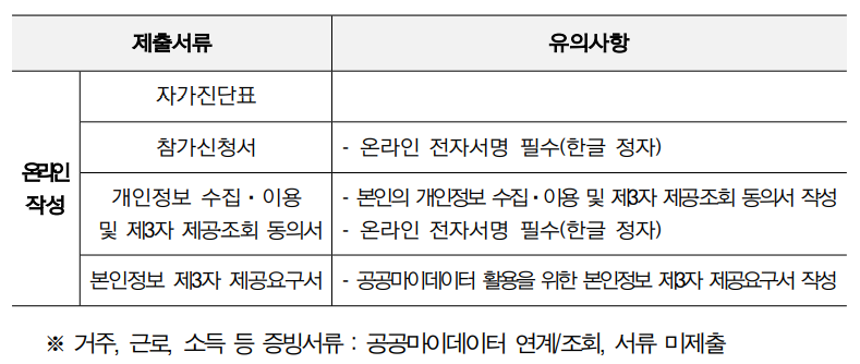 신청 시에는 몇 가지 필수 전자서명 서류도 함께 작성해야 한다. 온라인으로 자가진단표, 참가신청서, 개인정보 제공 동의서, 제3자 정보 제공 요구서 등을 작성해야 하며, 반드시 ‘한글 정자 서명’ 방식으로 전자서명을 완료해야 한다. 서류 제출은 종이서류가 아닌 전자서명 방식이며, 별도로 거주지나 근로 증빙 자료는 제출하지 않아도 된다. 이는 공공마이데이터 연계를 통해 자동으로 확인되기 때문이다.
