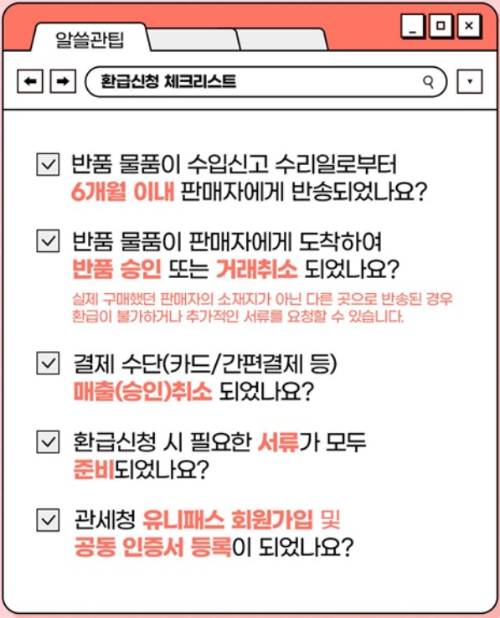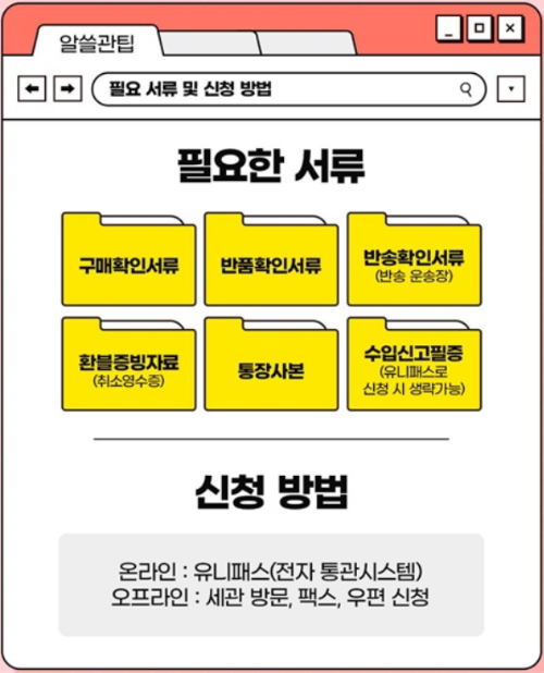 이외에도 환불 증빙자료는 카드사의 승인취소 내역서나 간편결제 취소 영수증으로 준비할 수 있으며, 통장사본도 함께 제출해야 합니다. 수입신고필증은 유니패스를 통해 신청할 경우 생략이 가능합니다.
