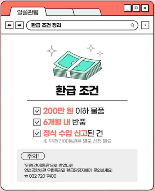 또한 수입신고가 정식으로 된 물품이어야만 환급 대상에 해당됩니다. 일반적으로 우리가 해외 직구를 할 때 택배로 받게 되는 물건들 중에는 우편이나 간이통관으로 들어오는 경우가 많습니다. 이럴 경우 환급 절차가 달라질 수 있기 때문에, 꼭 인천공항세관 우편통관과 환급 담당자에게 확인을 해보는 것이 좋습니다.