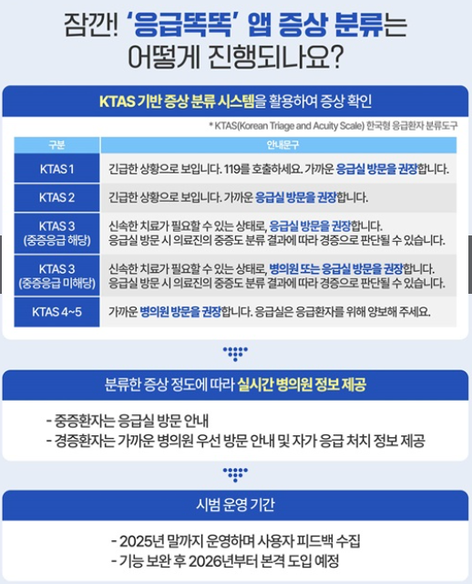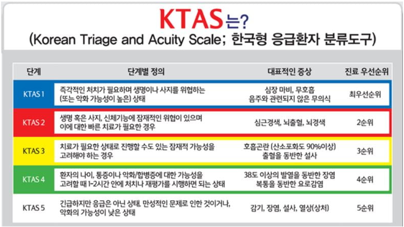 - KTAS 4~5단계: 경미한 증상으로 가까운 병의원 우선 방문을 안내하며, 응급실은 중증 환자에게 양보하도록 권고합니다.