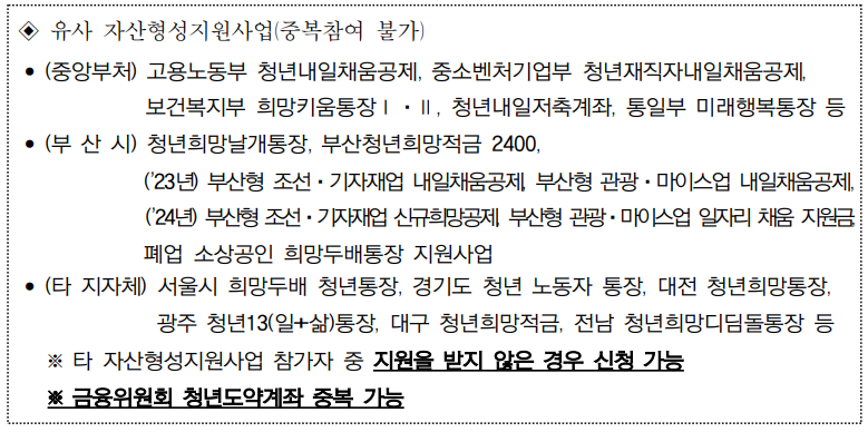 또한 유사한 자산형성 지원 사업에 참여한 이력이 있다면 이번 기쁨두배통장에는 신청할 수 없다. 중앙정부의 청년내일채움공제, 청년저축계좌, 보건복지부의 희망키움통장 등이나, 부산시 자체의 청년희망날개통장, 희망적금 2400 등의 프로그램에 참여했거나 수혜 이력이 있다면 신청이 제한된다. 단, 금융위원회의 청년도약계좌는 중복이 가능하므로, 현재 해당 계좌를 운용 중인 청년이라면 이번 통장에 함께 참여할 수 있다.