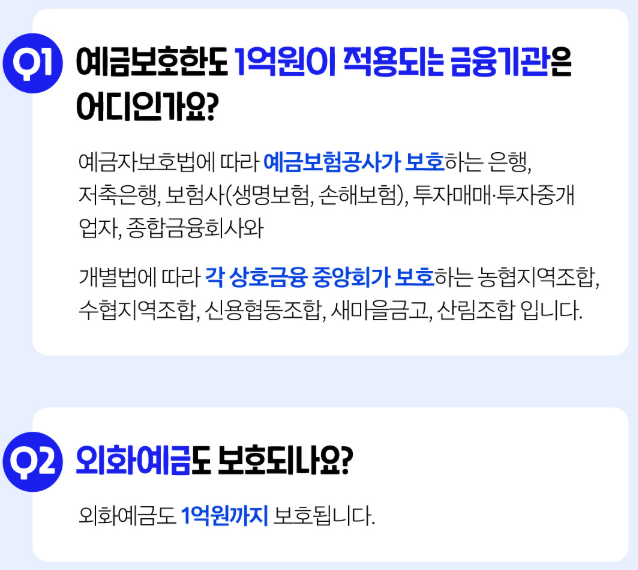 - A은행과 B저축은행에 각각 1억 원씩 있다면 → 각 기관별로 1억 원씩 전부 보호 (총 2억 원 보호)